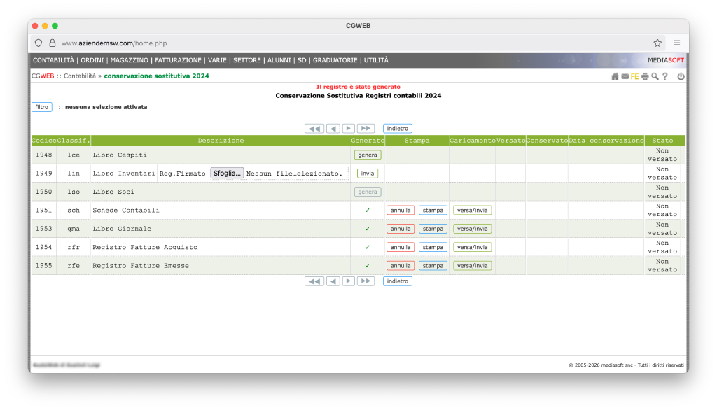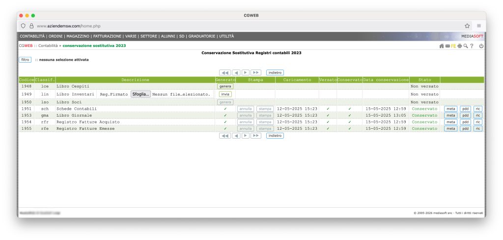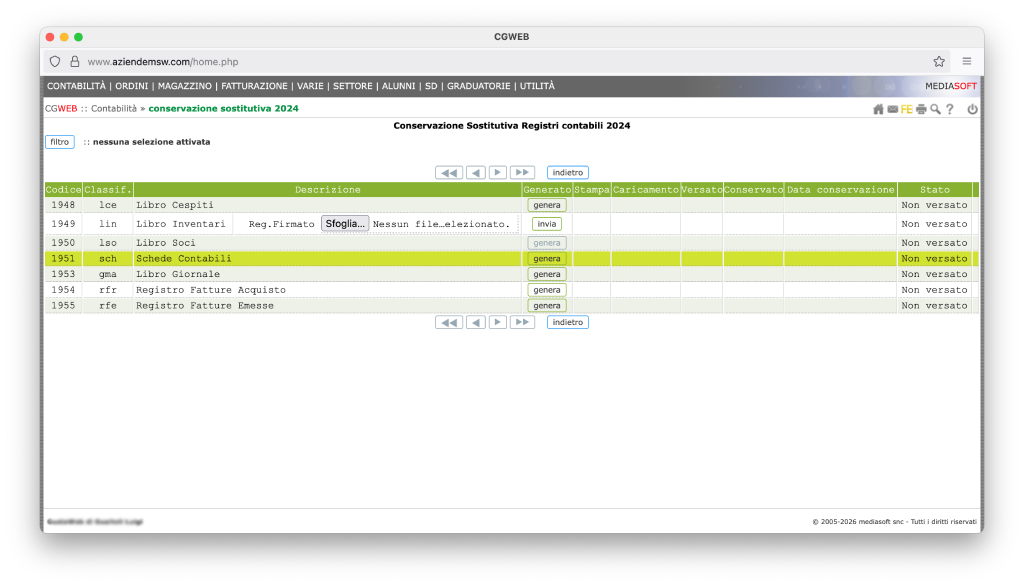 Troviamo in questa videata, per ogni tipologia di documento contabile conservabile, il pulsante “genera”. L’unico elemento che non viene generato in automatico è il libro inventari, che dovrà (se siamo obbligati alla sua conservazione digitale) essere firmato, scansionato in pdf e caricato manualmente nella procedura. Tutti gli altri elementi saranno estratti direttamente da CgWeb.