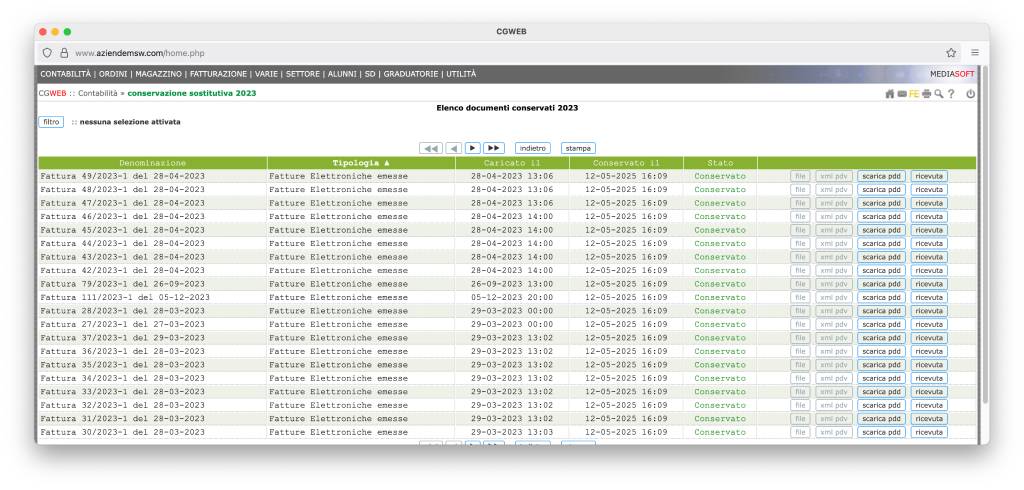 A questo punto dovremo attendere il tempo che il conservatore accreditato (Aruba) prenda in carico il versamento, apponga la propria marca temporale e firma digitale, generalmente un paio di giorni. Dopo di che troveremo nella stessa videata, nella colonna “data conservazione” il momento in cui l’elemento è stato effettivamente posto in conservazione (come vediamo nella successiva immagine di esempio, relativa all’anno 2023).