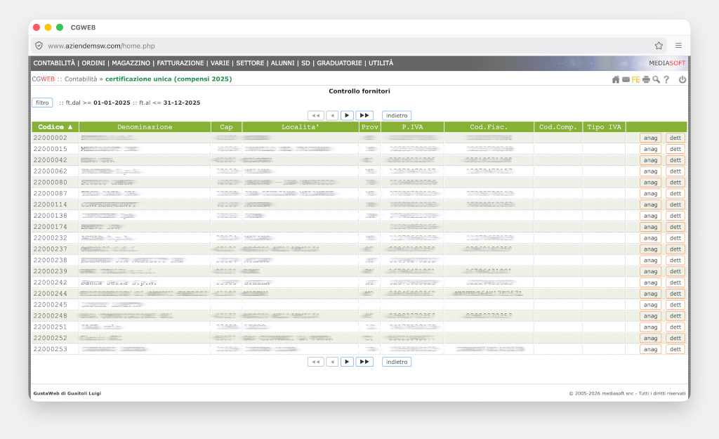 La procedura presenta una lista che mostra tutte le anagrafiche che hanno fatture nell’anno interessato; tramite il pulsante filtro possiamo velocemente verificare: