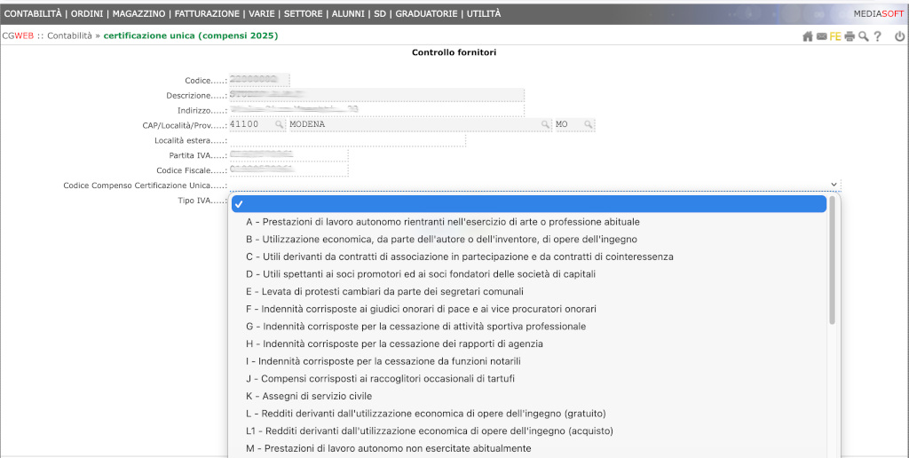 Sempre nella sezione anag si potrà indicare la tipologia del fornitore in oggetto. La generazione della CU pertanto compilerà la casella 6 in questo modo:
