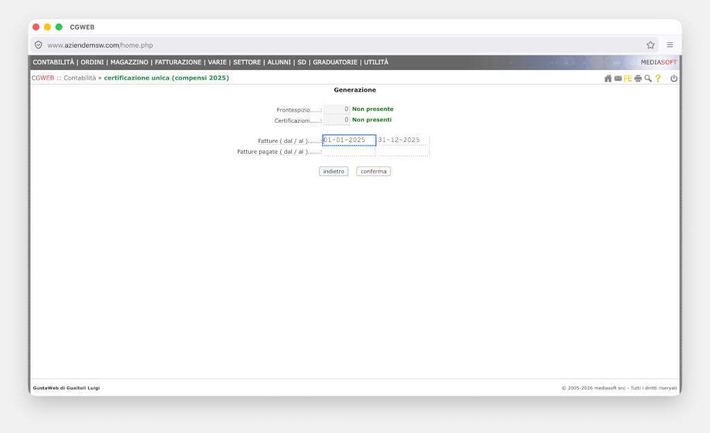 Tramite la chiamata Stampe e File Telematico – certificazione compensi è possibile produrre un prospetto da inviare al fornitore con l’elenco di tutti i compensi corrisposti.