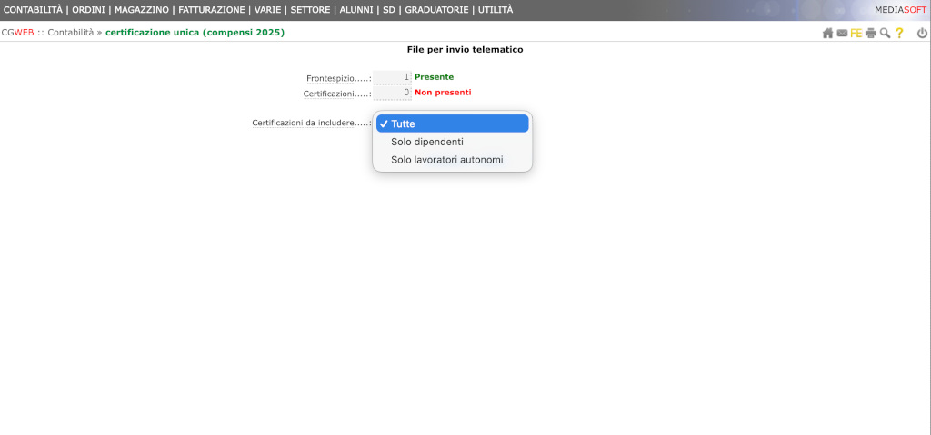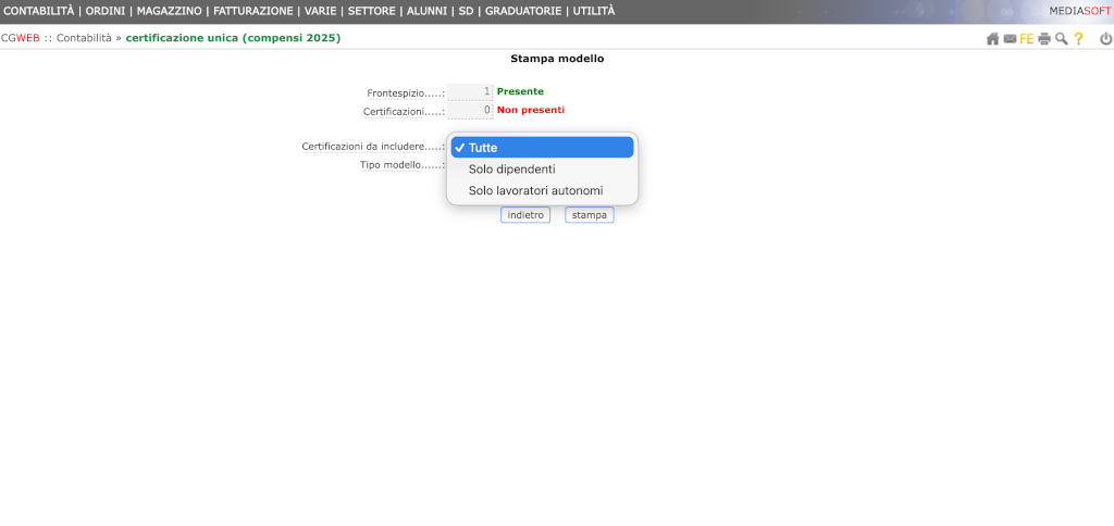 Sia nella procedura di stampa modello che nella procedura di generazione del file telematico è possibile selezionare quali certificazioni includere ( tutte / solo dipendenti / solo lavoratori autonomi).